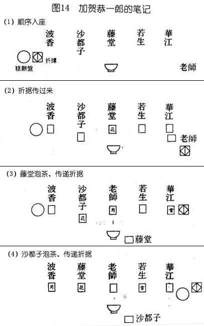 关于雪月花之式,我虽然没有经验,但以前学茶道时,却曾做过几次花月之式。相信你也知道,花月之式就是只有泡茶的人(花)和喝茶的人(月),由花月牌来决定。参加者有五人,牌有花、月、一、二、三等五张,顺序跟雪月花同样,前次没抽到花或月牌的人,要从折据中抽一张,也就是说,折据中除了花和月牌之外还有另一张号码牌。所以跟雪月花之式不同,抽到那张牌的人,不必做任何事。